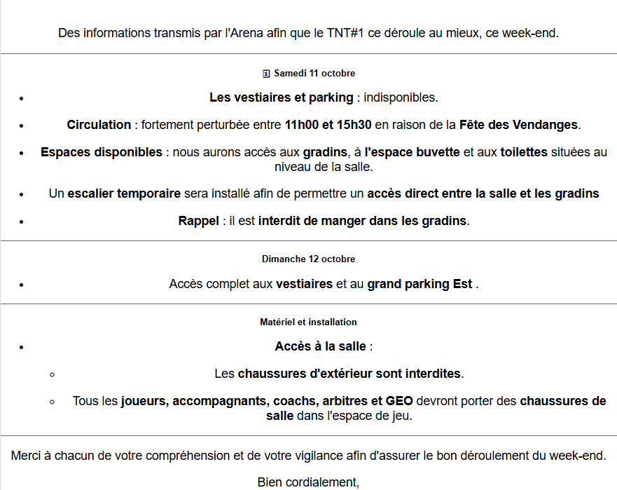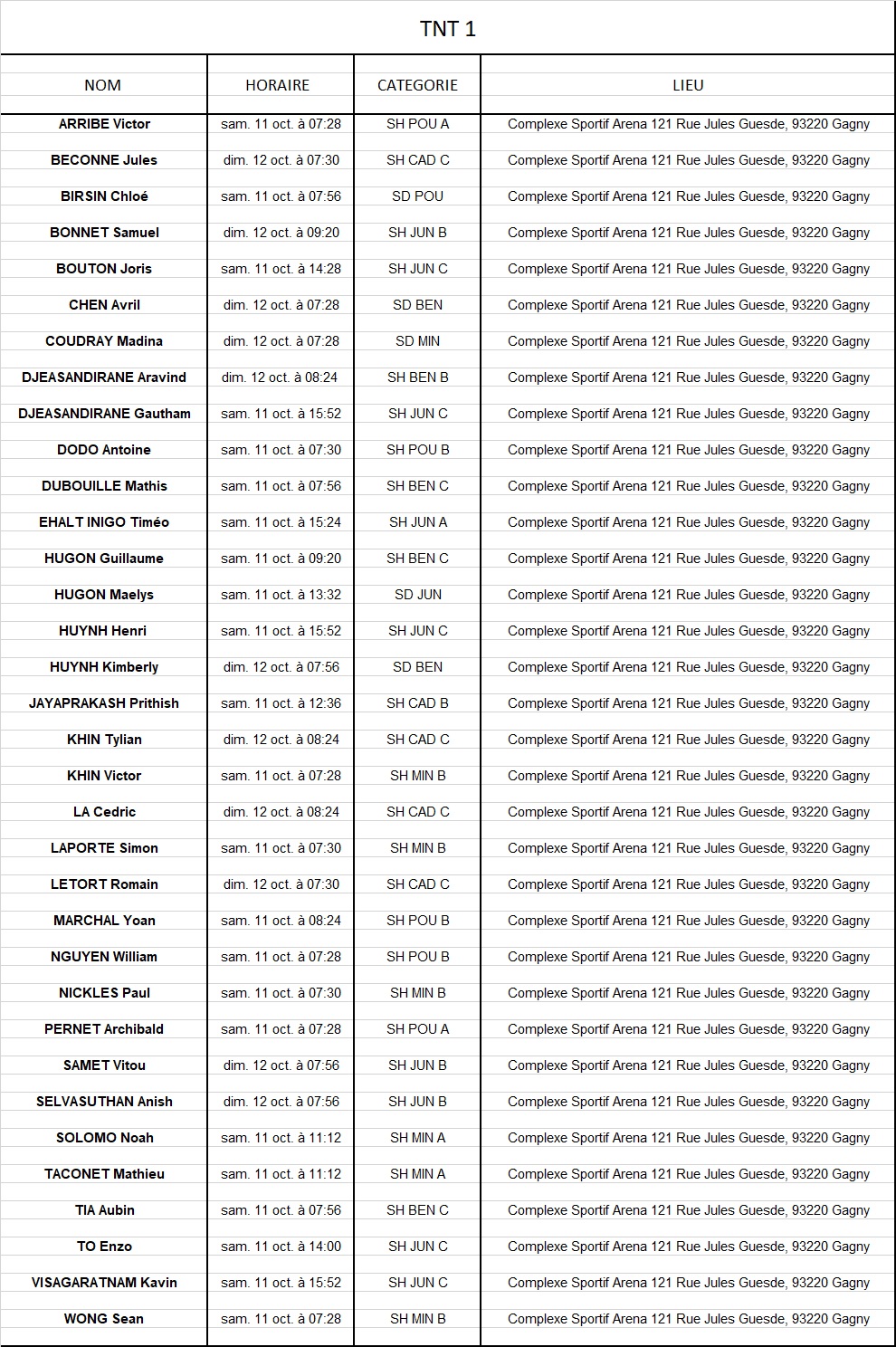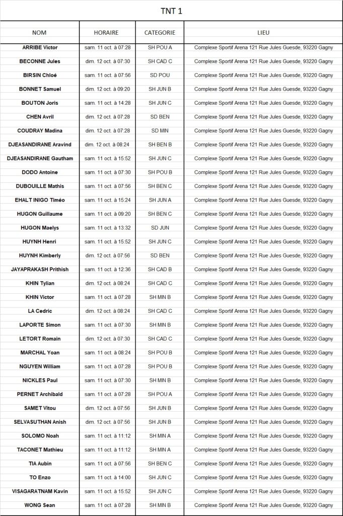 Publié le 8 octobre 20258 octobre 2025 par L. Philippe TNT 1 (Tournoi du Neuf Trois) aura lieu les 11 et 12 Octobre et le PAD le 11 Octobre à Gagny. 08/10 : Convocations TNT-1 et info